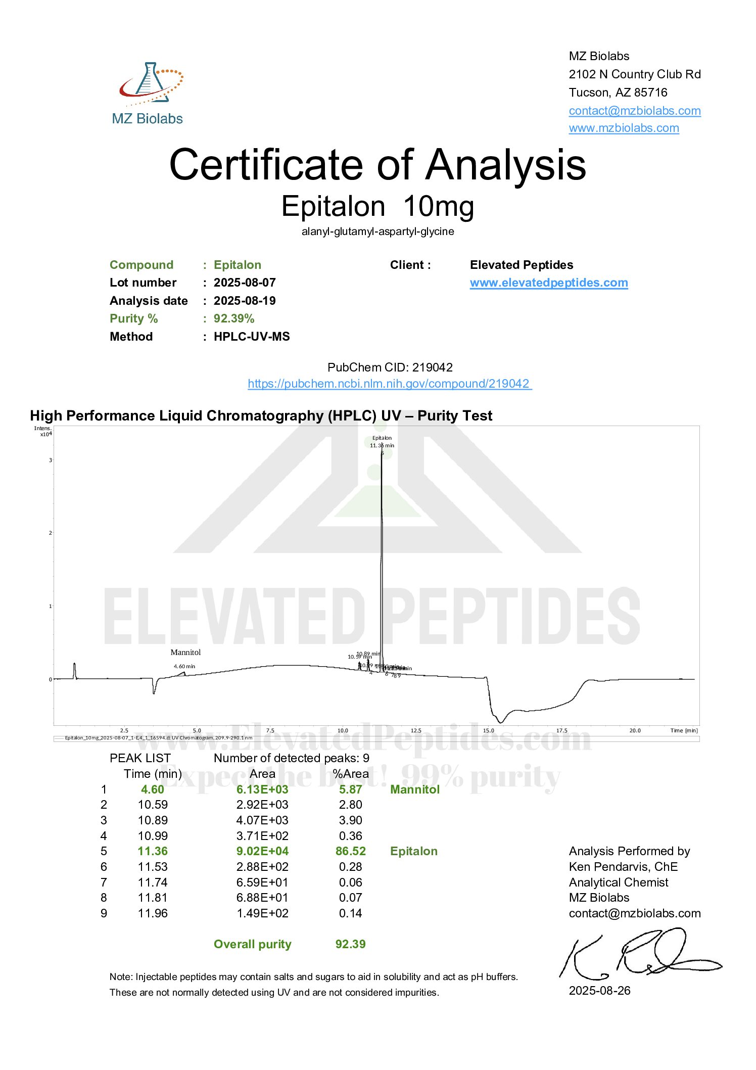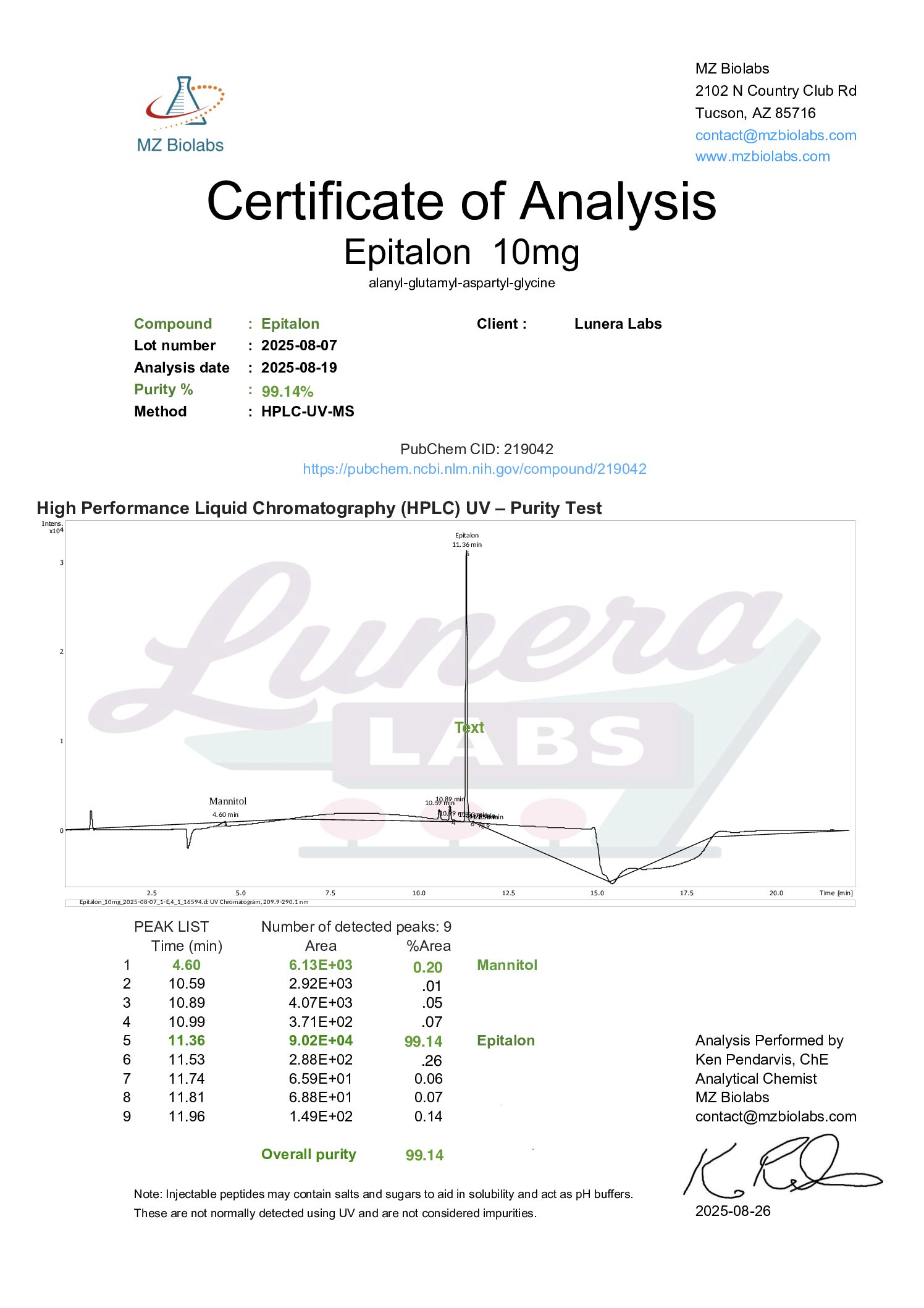 Epithalon (Epitalon) is a synthetic analog of Epithalamin, a peptide naturally produced in the pineal gland. Research suggests it may act as a modulator of telomerase, the enzyme responsible for maintaining telomere length at the ends of chromosomes. Studies have investigated its potential role in telomere elongation, oxidative stress reduction, and cellular aging processes.